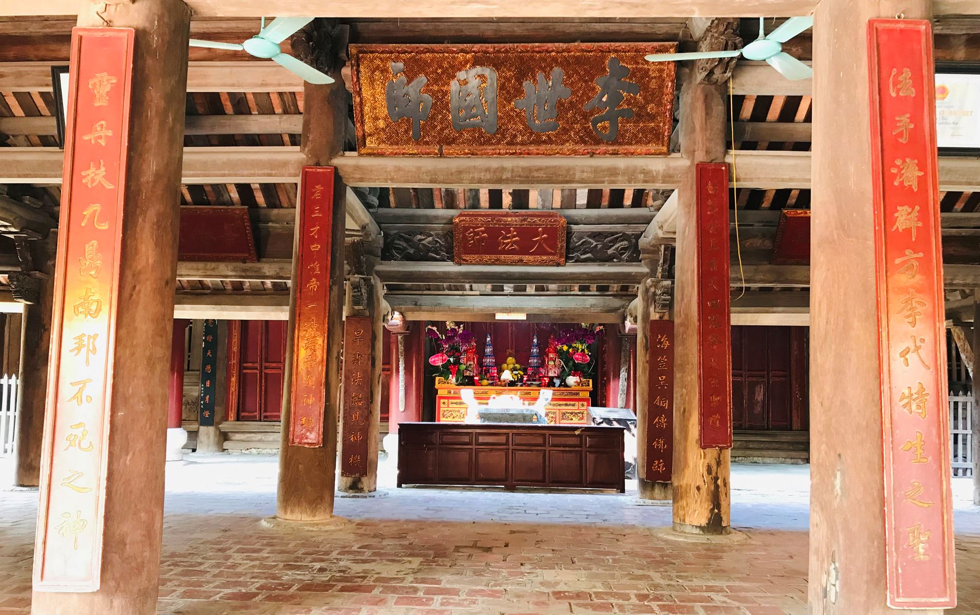 Gian giữa trung tâm đặt bàn thờ, bát hương thờ cộng đồng. Hai gian bên hổi đặt hai kiệu long đình.