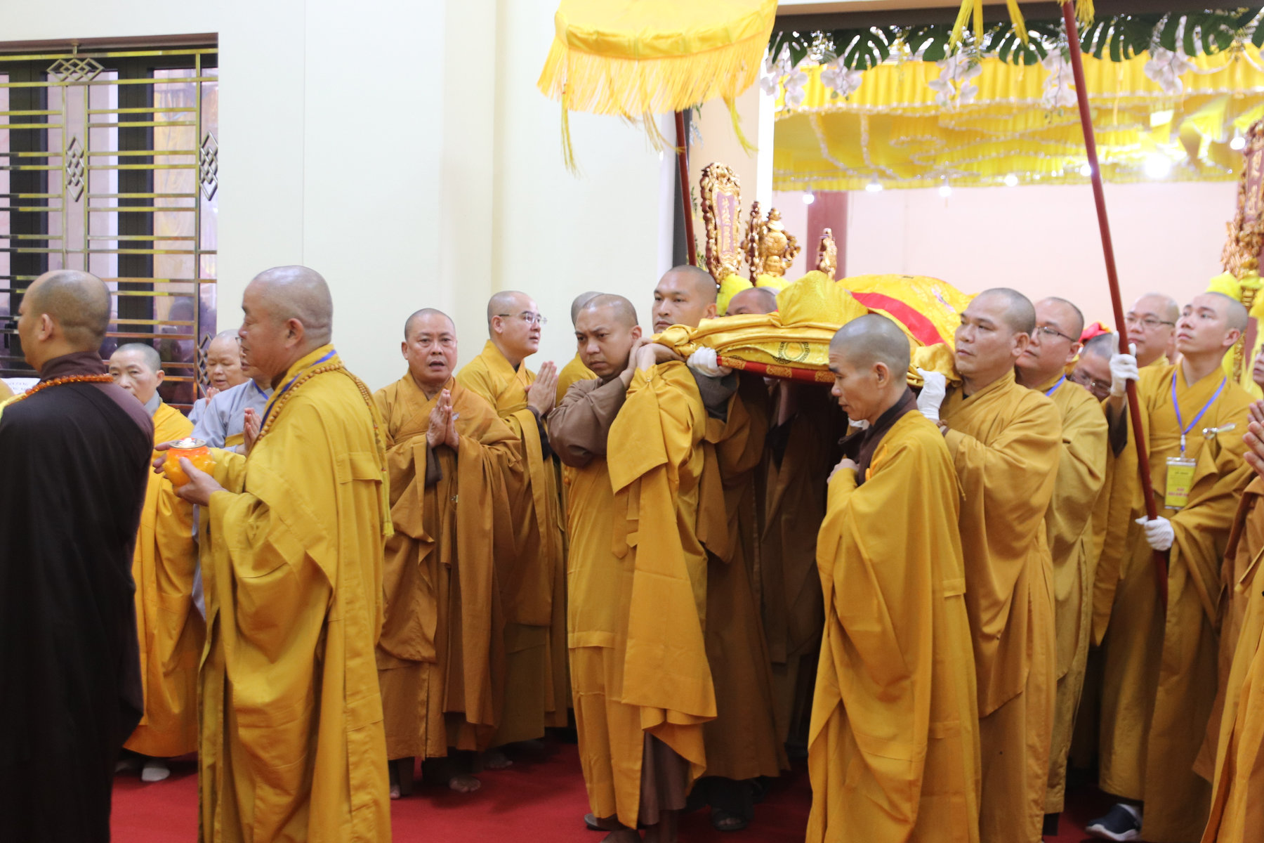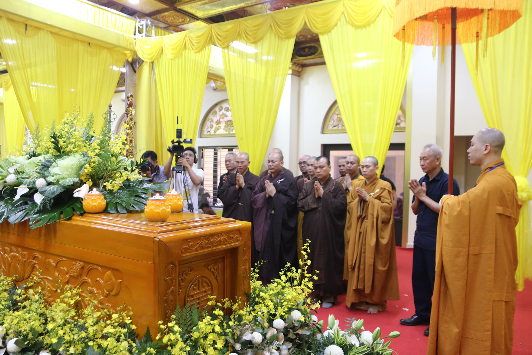 Sau khi cung nghinh chư Tôn đức Tăng Ni quang lâm, Đại đức Thích Thanh Quang, Phó Trưởng ban kiêm Chánh Thư ký Ban Trị sự GHPGVN tỉnh Hưng Yên thay mặt môn đồ pháp quyến, hiếu quyến dâng lời tác bạch cầu thỉnh. Chư tôn đức đã làm lễ niêm hương bạch Phật, sái tịnh Giác linh đường, trì tụng Đại bi thập chú dưới sự xướng lễ của Thượng tọa Thích Minh Quang, Phó Trưởng ban Thường trực Ban Nghi lễ TƯ; cầu siêu tiến Giác linh. Trong tiếng niệm Phật trầm hùng của đại chúng, môn đồ pháp quyến đã cung thỉnh nhục thân cố Trưởng lão Hoà thượng từ thiền thất về Giác linh đường cử hành lễ nhập kim quan theo nghi thức Thiền môn.